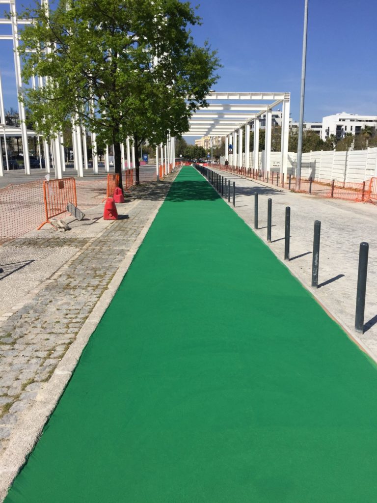 Fornecimento do nosso material, Slurry Seal, para a execução da Ciclovia na zona adjacente ao Pavilhão MEO ARENA e FIL de Lisboa – COMPOSEAL SINTÉTICO na cor VERDE RAL 6029, que foi a cor escolhida pela Câmara de Lisboa, para a zona do Parque das Nações – Expo.