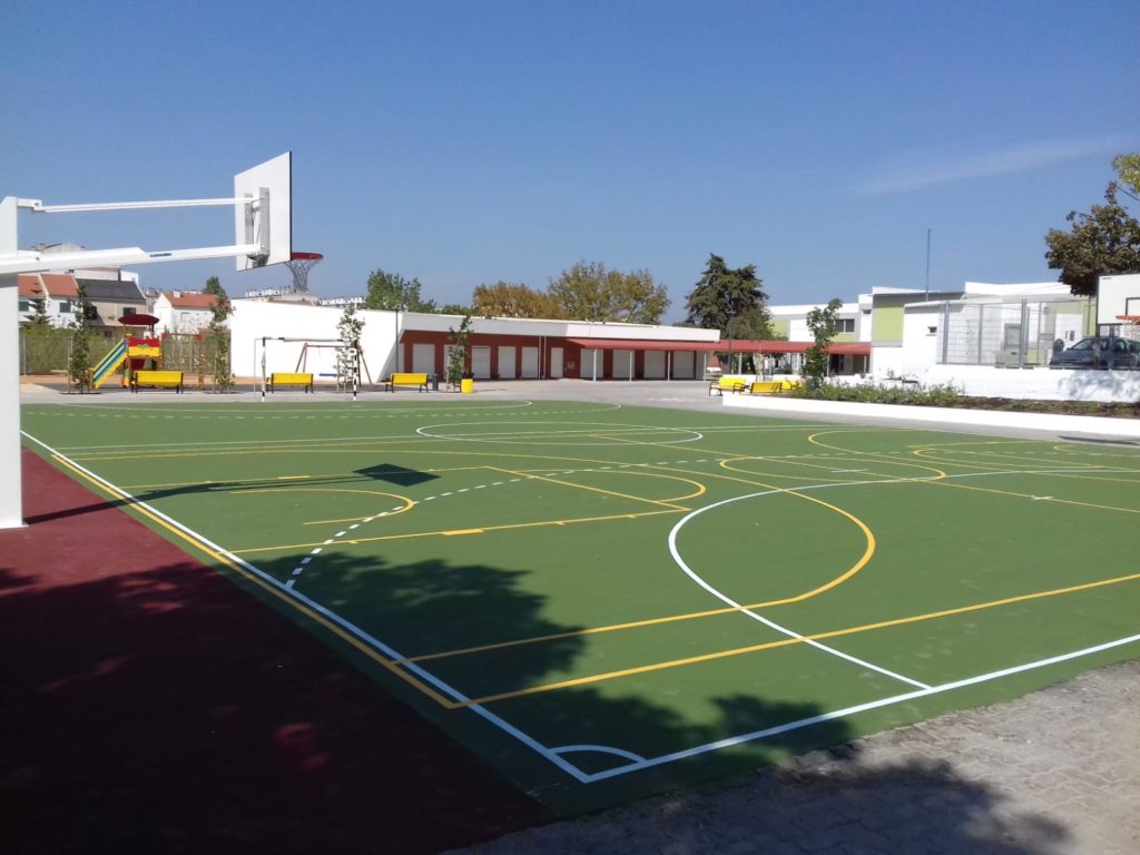 Fornecimento e Instalação do Campo Poli desportivo na Escola do Vale da Amoreira com o nosso Sistema Sportplus da Maxasphalt sendo um Revestimento para campos poli desportivos desportivos no geral de Betuminoso , através da aplicação de sistemas multi camadas com resinas acrílicas incluindo as marcações de Jogos.