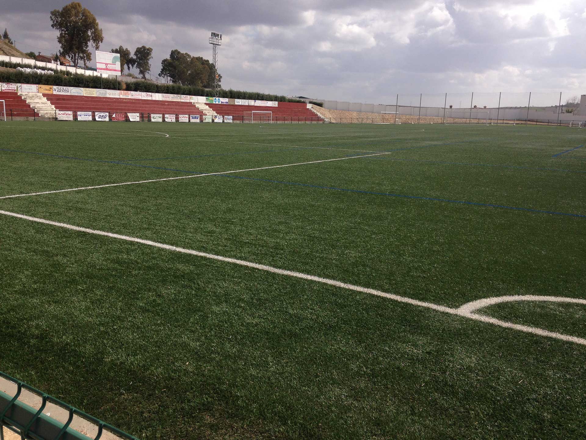 Fornecimento de relva sintética, MRPRO de ultima geração com altura de 60mm, com 13.000 dtx, resistente a UV, composta por fibras retas de concepção monofilamentar especialmente concebida para a prática do futebol, com duas tonalidades verdes, fornecimento do nosso SBR Negro granulado de borracha, bem como as linhas de jogo para campo de futebol de 7 e 11, garantindo o cumprimento dos parâmetros exigidos para que a solução implementada obtenha a certificação FIFA 2 Estrelas.